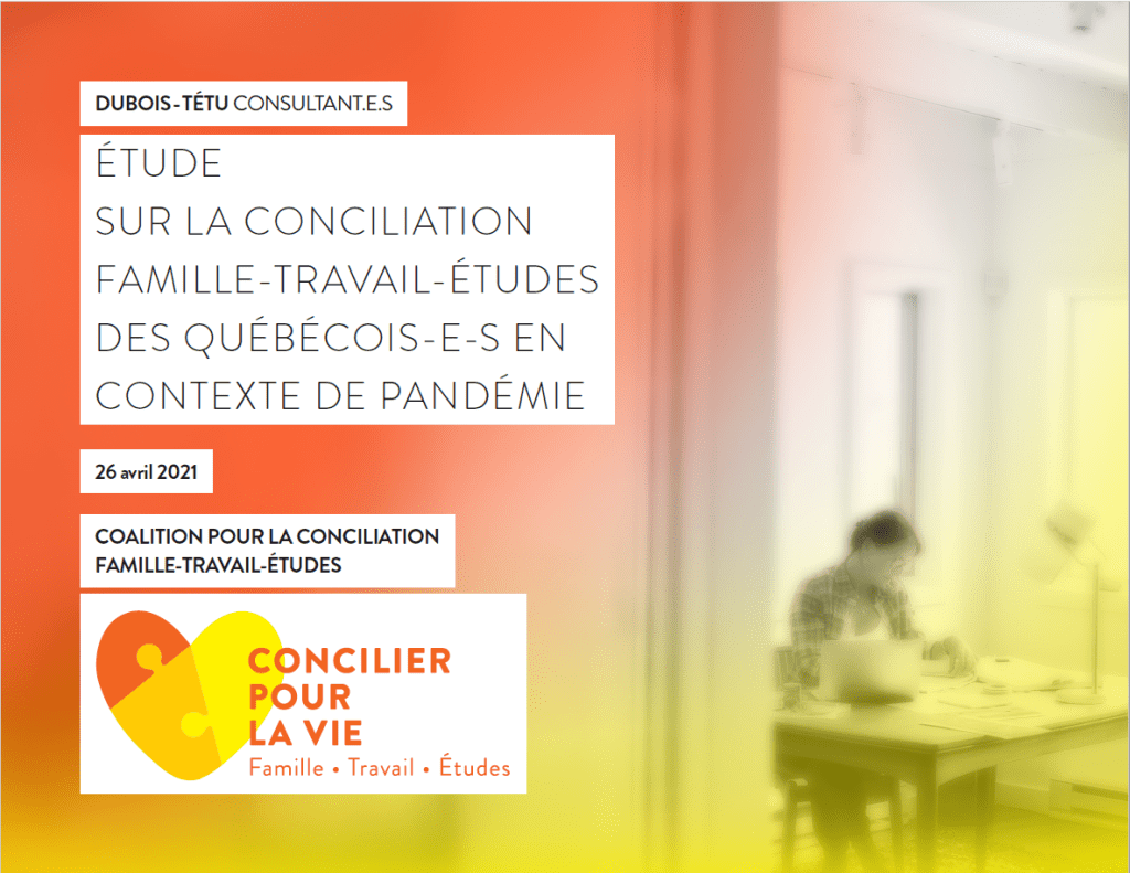 Entre le 18 mars et le 12 avril 2021, la Coalition pour la conciliation famille-travail-études (CCFTÉ) administrait un quest ionnaire en ligne afin de connaître les impacts de la pandémie sur la société québécoise, notamment à l’égard des défis rencontrés dans la conciliation de différents rôles. L’échantillon total du questionnaire est de 1 009 répondant-e-s.